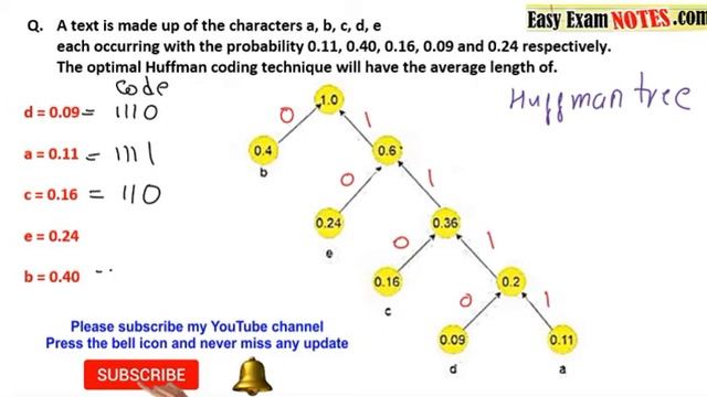 Characters a,b,c,d,e probability 0.11,0.40,...... Optimal Huffman code have average length of