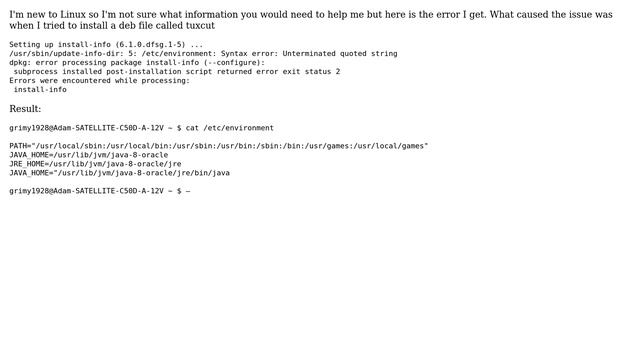 Ubuntu: /usr/sbin/update-info-dir: 5: /etc/environment: Syntax error: Unterminated quoted string