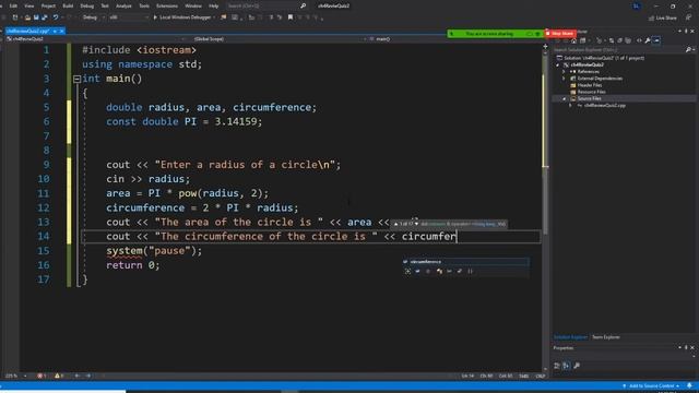 C++ programming, a program calculates the area and circumference of a circle