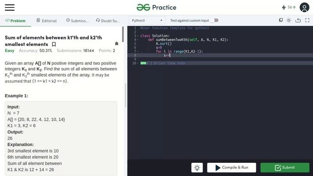 Sum of elements between k1'th and k2'th smallest elements || gfg || problem of the day 29-06-2022
