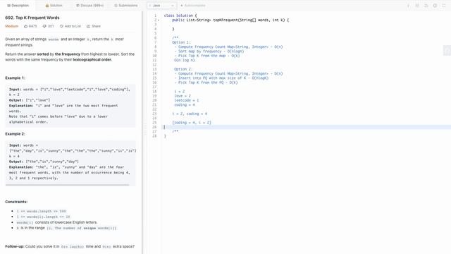 Leetcode 692 Top K Frequent Words (Java)
