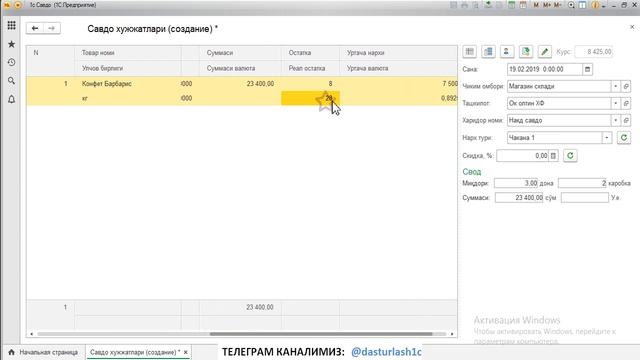 1C Бухгалтерия Омбор 2 Товар сотиш