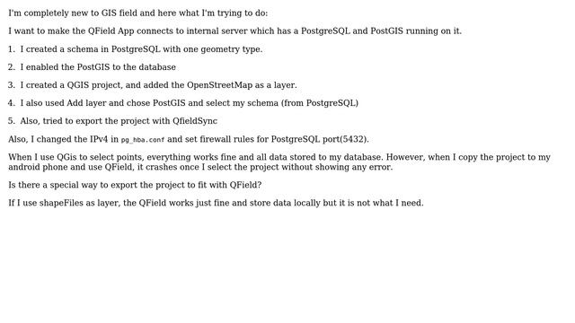 GIS: QField App crashes when connect to internal server of PostgreSQL and PostGIS