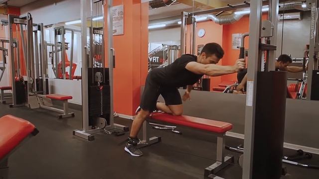 56 махи в кроссовере на ягодичные мышцы с нижнего блока с упором колена на скомье
