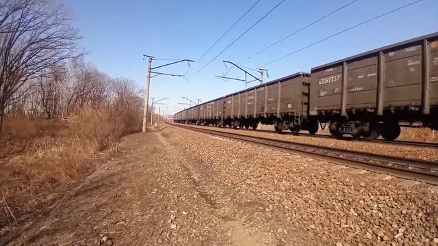 Спустя год. 2ЭС5К-021 "Ермак" с грузовым поездом и приветливой бригадой