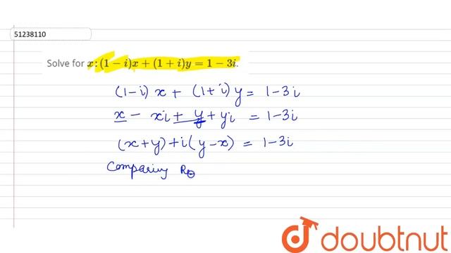Solve for `x: (1-i)x + (1+i)y=1 - 3i`.