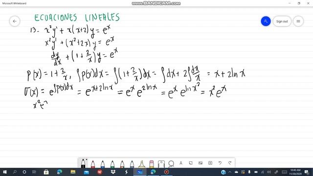 13. x^2 y'+x(x+2)y=e^x. Ecuaciones lineales. Alexander Estrada