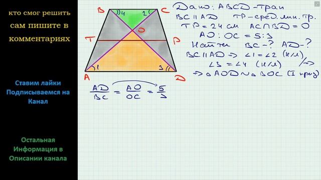 Геометрия Средняя линия трапеции ABCD (BC II AD) равна 24 см, а ее диагонали пересекаются в точке O
