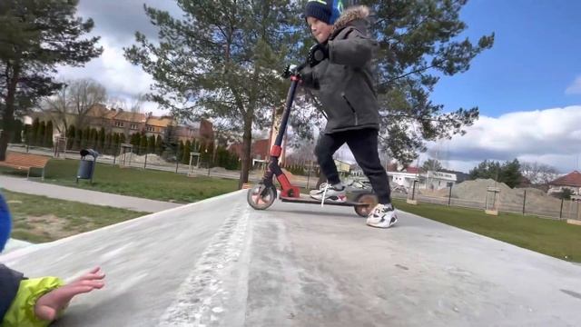 Макар и Леон в скейт?парке. Мини Банда на самокатах, первый раз пробуют кататься. Польша - Вроцлав