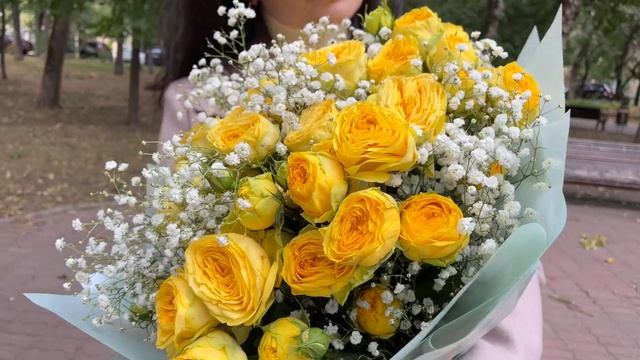 Букет из желтых пионовидных роз с гипсофилой