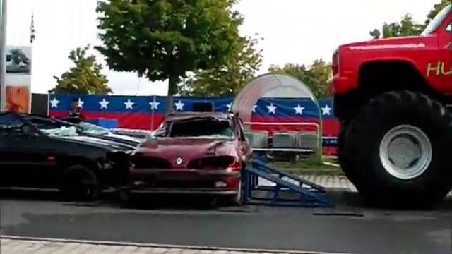 Джип монстр давит машины во время шоу. Monster Truck Red Hunter