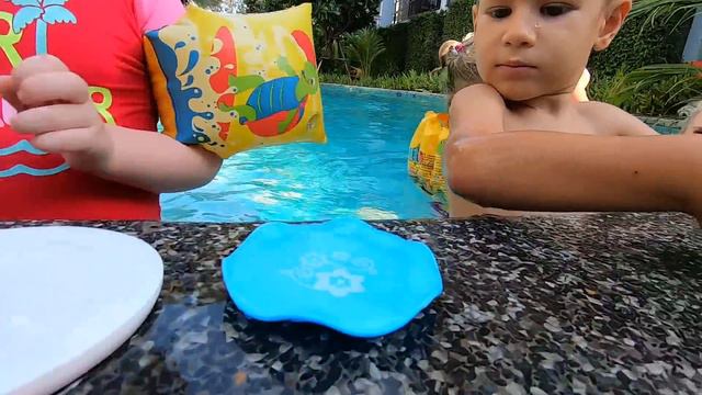 Алена с детьми играет в игры для детей в детском бассейне. Играем с игрушками бегемот, крокодил