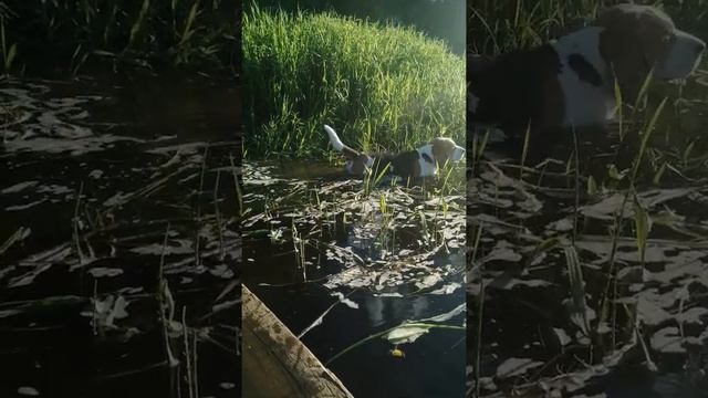 Бигль плавает в речке)