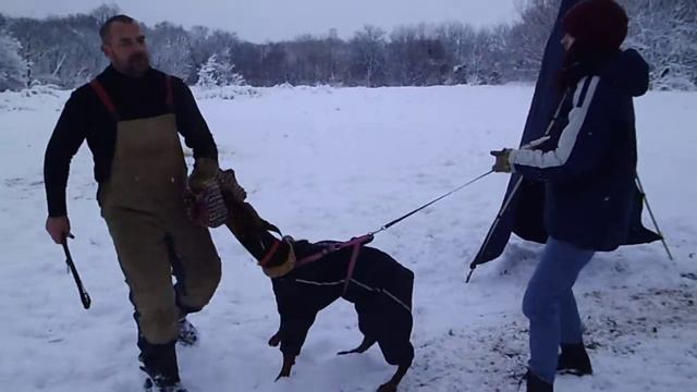 Purebred black doberman is hunting in a winter forest in slow motion