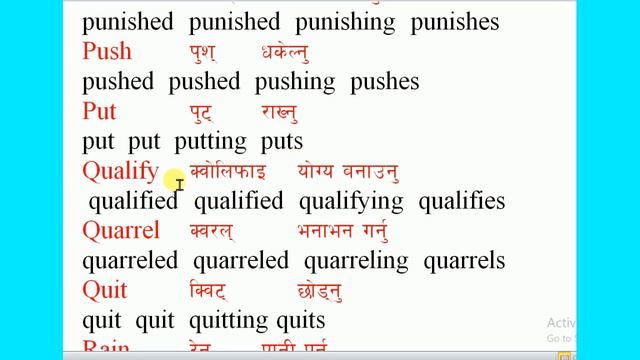 VERBS: root/past/continuous/past participle forms with pronunciation & Nepali meaning for students