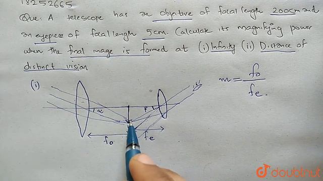 A telescope has an objective of focal length 200 cm and eyepiece of focal length 5 cm.