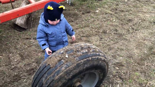Что интересно сыну на прогулке в деревне. Сеялка СЗ-5.4, диски, земля, поле и коровы. Зима 2023.