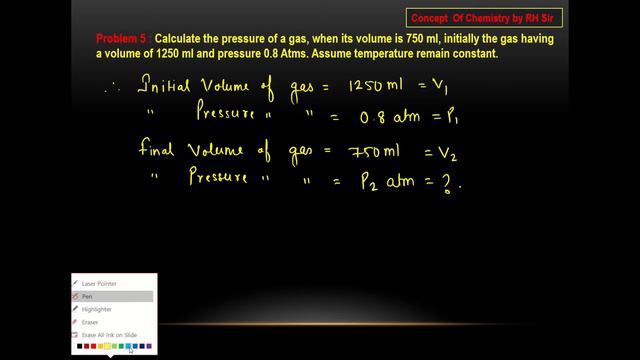 Calculate the pressure of a gas, when its volume is 750 ml, initially the gas having