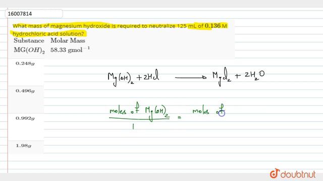 What mass of magnesium hydroxide is required to neutralize 125 mL of `0.136` M hydrochloric acid