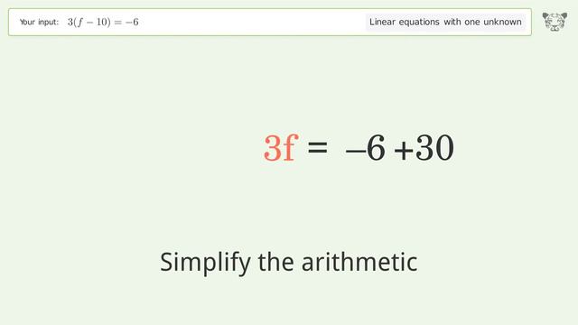 Solve 3(f-10)=-6: Linear Equation Video Solution | Tiger Algebra