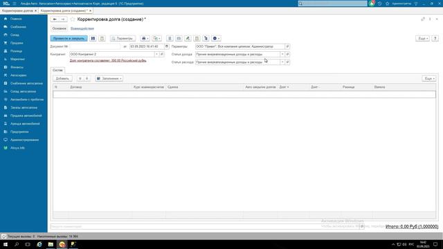 Корректировка долга в 1С Альфа-Авто 6