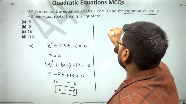 If 2 is a root of the equation x2 +bx +12 = 0 and the equation x2 +bx +q = 0 has equal roots, then