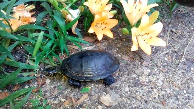 Черепаха возле лилий