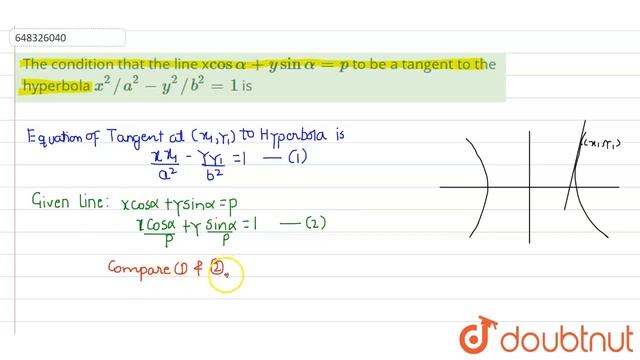 The condition that the line x cos alpha + y sin alpha =p to be a tangent to the hyperbola x^(2)...