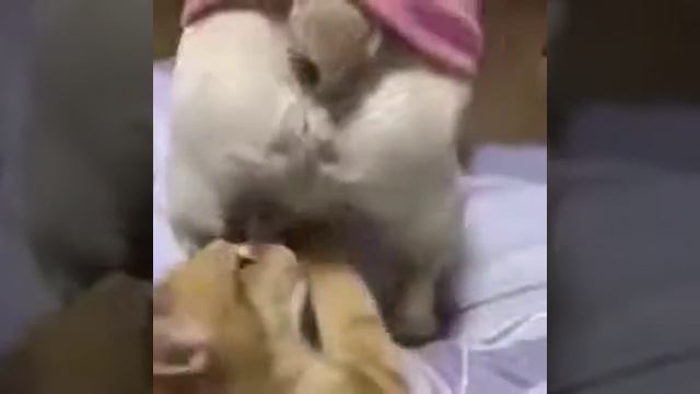 Котёнок играет с яйцами собаки