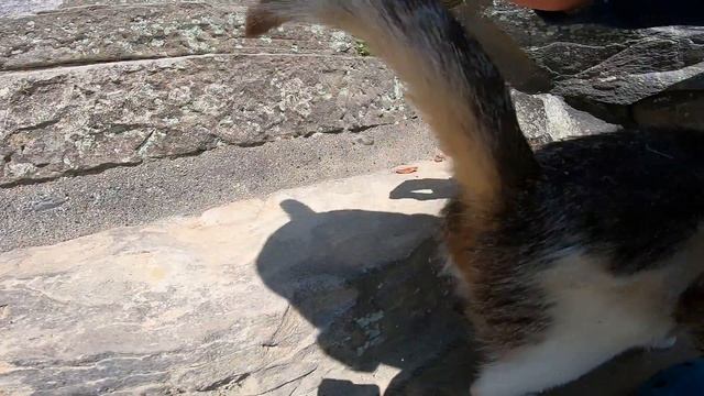 神社の階段下で出会った野良子猫、最初は警戒していたがナデナデしてたら懐いてきた