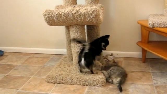Mi-ki puppy playing with Siberian kitten