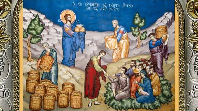 Он взял 5 хлебов и 2 рыбы, воззрев на небо, благословил их. От Мк. 6:30-45