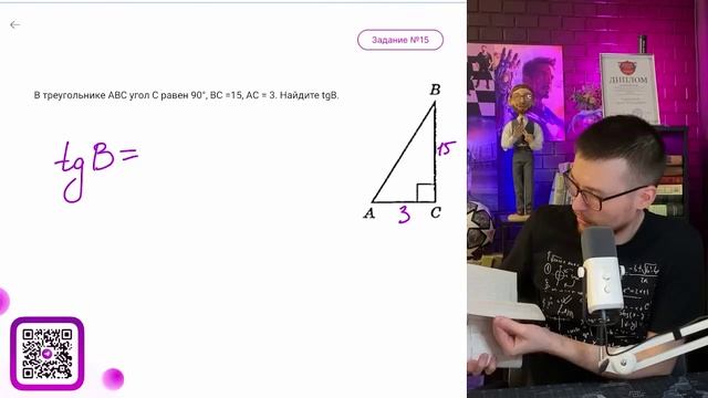 В треугольнике АВС угол С равен 90°, ВС =15, АС = 3. Найдите tgB. - №12155