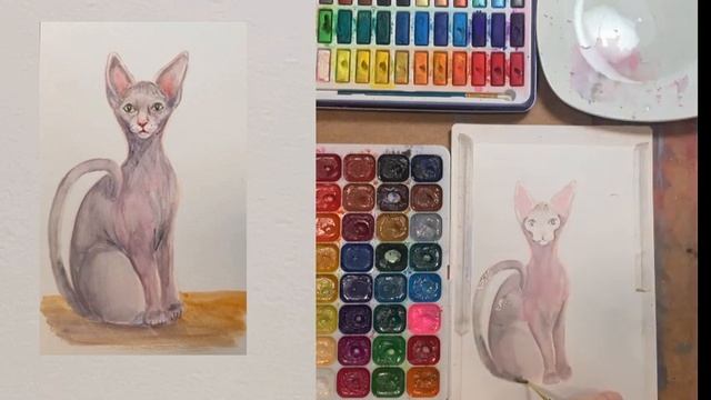 Кот породы Сфинкс. Как нарисовать акварелью и акварел?
