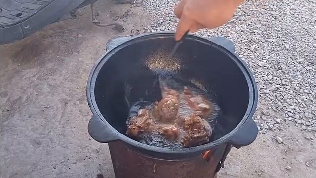 Казан-кебаб в казане на костре.
