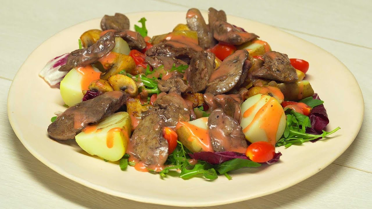 Теплый салат с куриной печенью.
