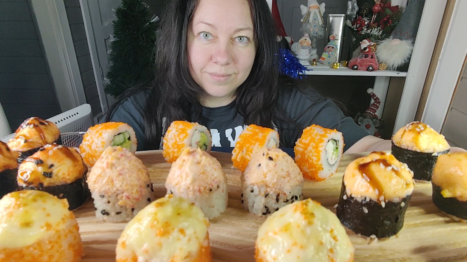 Мукбанг Роллы запеченные, Калифорния, Шиитаке пиканто, Тигровая креветка с моцареллой, Аяши XL
