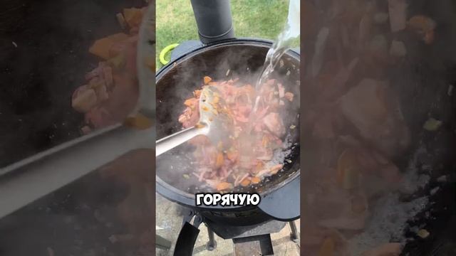 4. Осталось добавить рассол от огурцов и отправить чугунок в печь минут на 40.