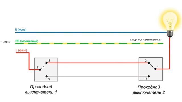 Подключаем выключатель на две лампочки из двух мест.