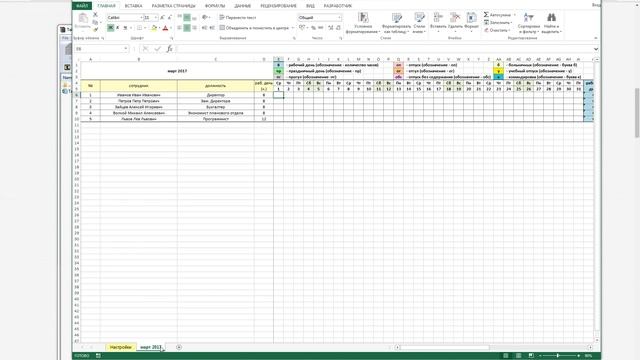 табель учета рабочего время с автоматической подкраской выходных, расчетом нор рабочего времени