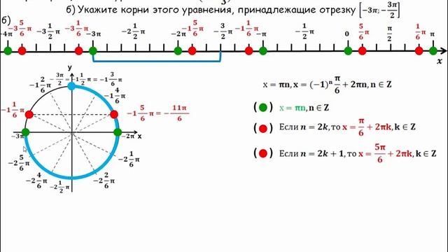 отбор корней в тригонометрических уравнениях с помощью окружности. смотреть онлайн