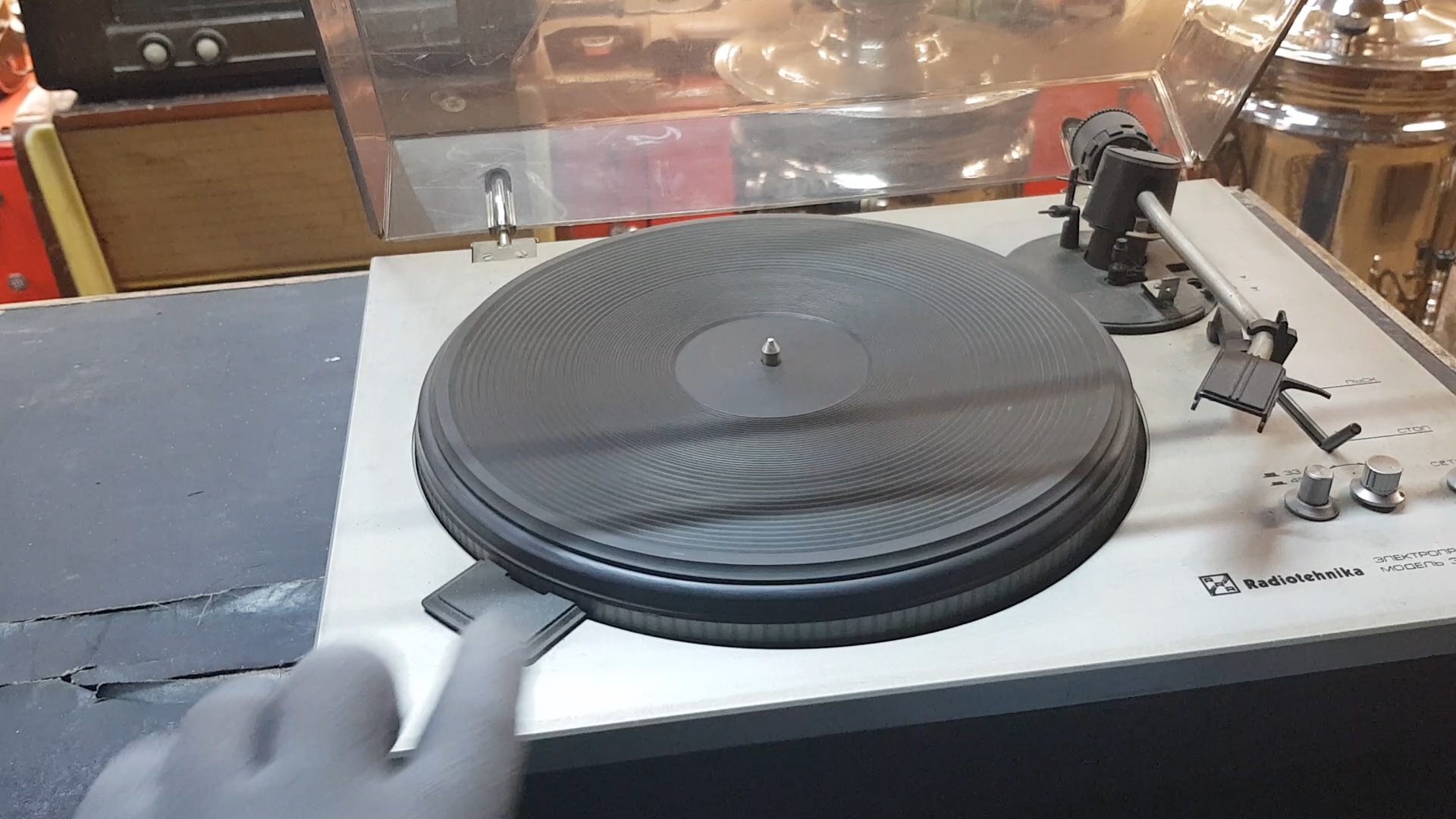 Ремонт и настройка проигрывателя Радиотехника ЭП-101. Ремонт: возврат звукоснимателя в исходное (неработающее) положение (п.10 инструкции по эксплуатации), ремонт (настройка) кнопки переключения скорости 33/45, защитный колпак на механизме звукоснимателя-правильная установка, "плывет" скорость - замена пассика (ремня приводного), смазка подшипника, настройка автостопа. Настройка давления иглы звукоснимателя.