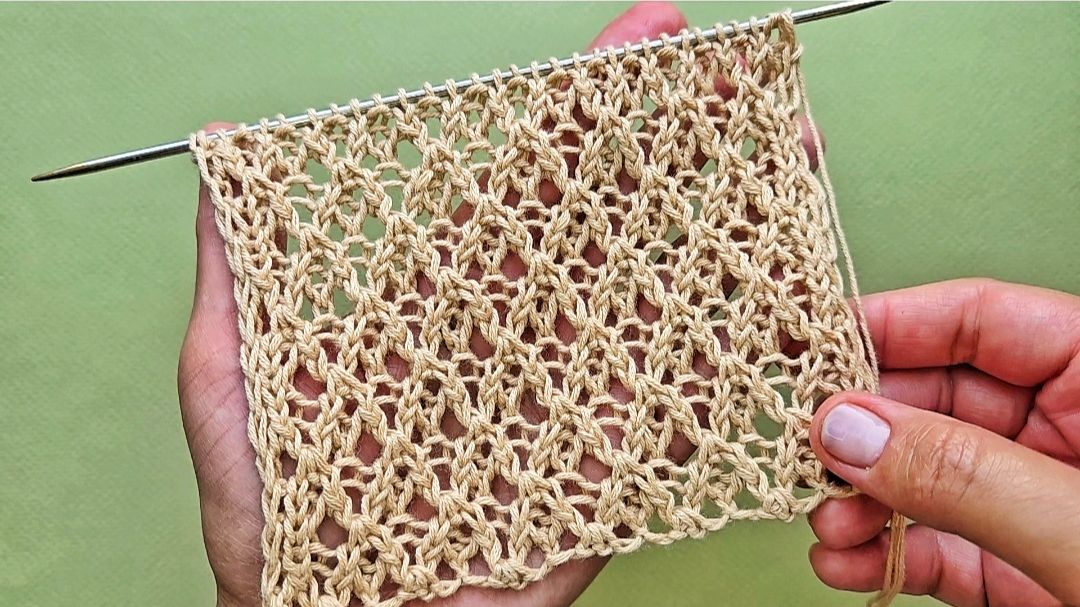 Ажурный узор с рельефными ромбами из удлиненных петель. Универсальный узор для вязания многих ажурных женских и детских изделий: джемперы, кардиганы, летние топы, носки и другие.
