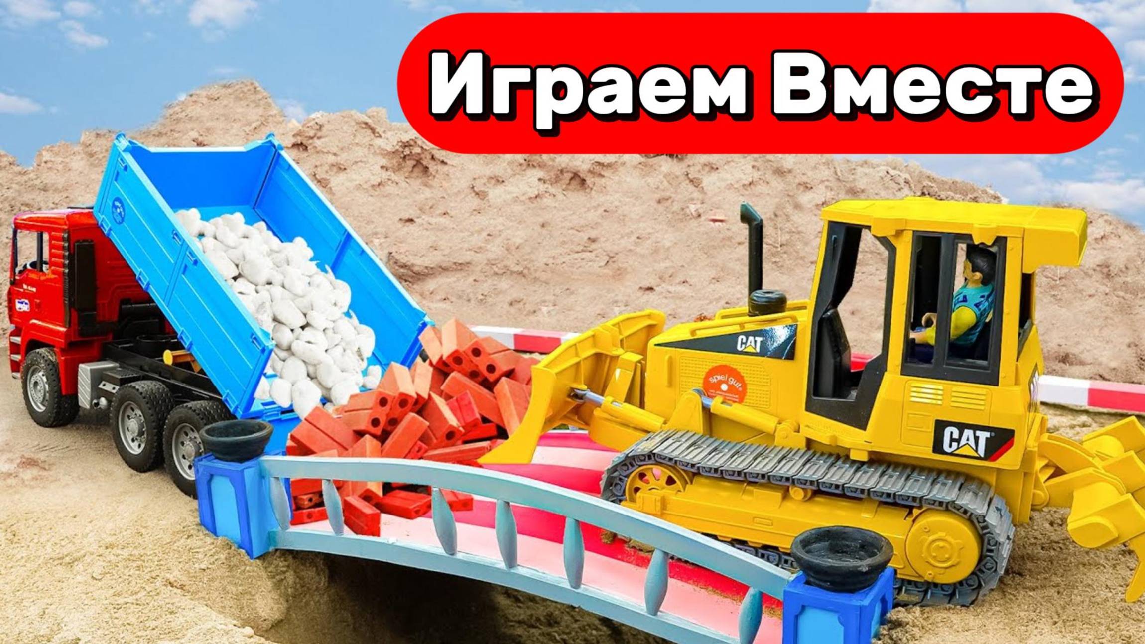 В ролике рассказывается о том, как строительная техника строит дом с водяной мельницей.