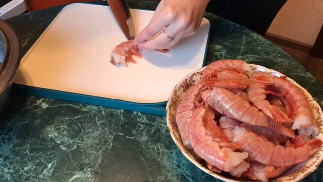 1.Размораживаем, убираем голову (если хотите эффектней подать, оставляйте), разрезаем хвост пополам и промываем, чтобы убрать пищевод.