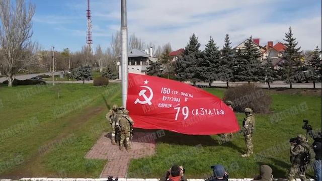На видео копия штурмового знамени, которое 1 мая 45-го советские солдаты установили над Рейхстагом. Знамя попросили изготовить военнослужащие из Севастополя, участвующие в специальной военной операции.