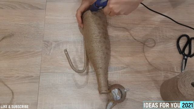 Кошка из джута прекрасный и оригинальный подарок сделанный своими руками. Смотрится отлично, делается просто. Сначала обматываем джутом бутылку и мячик или шарик для рукоделия. Затем формируем платье и делаем мордочку кошке. Укрепляем голову гипсом.