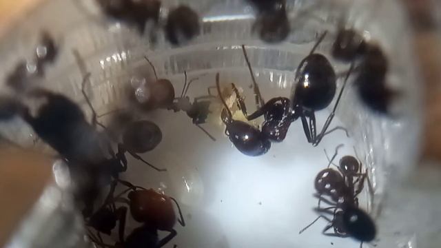 Окрас: у королевы и у солдат темно-красная голова, а все остальное черное; рабочие же черные целиком.