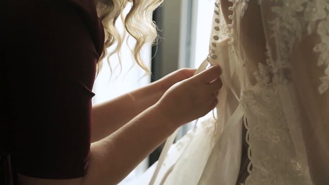 Подружка помогает невесте одевать свадебное платье. Туфельки невесты, свадебные серёжки, подвязка невесты. Невеста ожидает приезда жениха, начало свадебного дня.