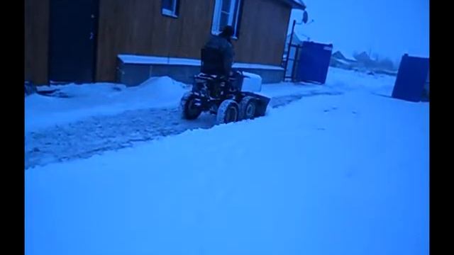 уборка снега мотоблоком МБ-2 на гусеницах с самодельным передним адаптером.
